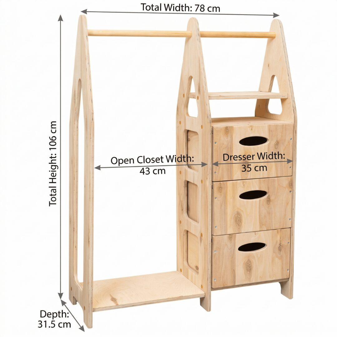👗 Armoire dressing Montessori 3-en-1 en bois naturel : penderie ouverte, 3 tiroirs et étagères — tout rangement en un seul meuble compact. 📐 Dimensions L78 × H106 × P31,5 cm, contreplaqué marine robuste, poignées ovales évidées. Favorise l’autonomie et l’organisation dès 2 ans.