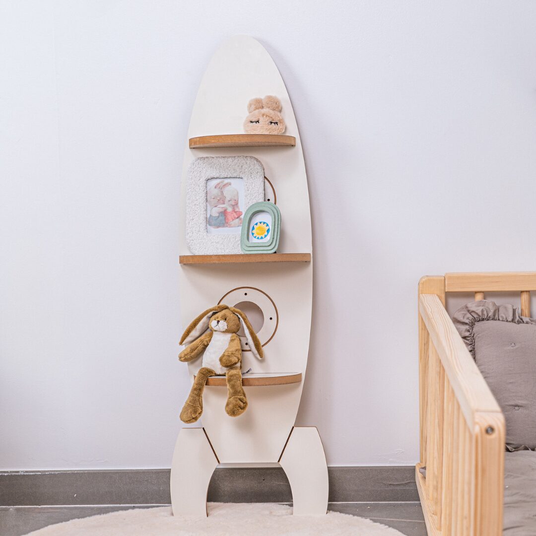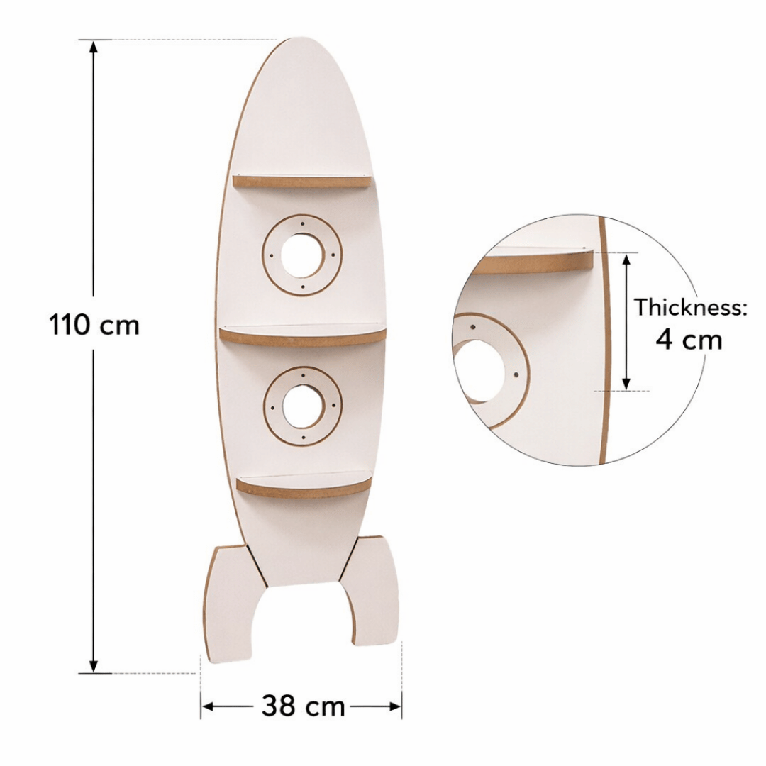 • 🔄 Étagères rondes intégrées dans la forme fusée — fonctionnelles et décoratives