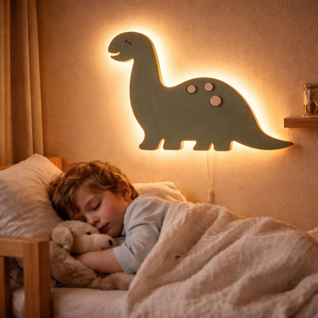 Pour les petits fans de dinosaures, voici une veilleuse hors du commun : la Veilleuse Murale Dinosaure Cozy Kids met en scène un brontosaure kawaii en bois découpé laser vert sauge — grand cou élancé, queue effilée, bouche souriante, œil espiègle découpé dans la masse — orné de 3 rondelles bois naturel en relief sur le dos pour un détail artisanal unique. Son rétroéclairage LED contour doré enveloppe toute la silhouette préhistorique d’un halo chaleureux et spectaculaire. La chambre dino parfaite commence ici.
