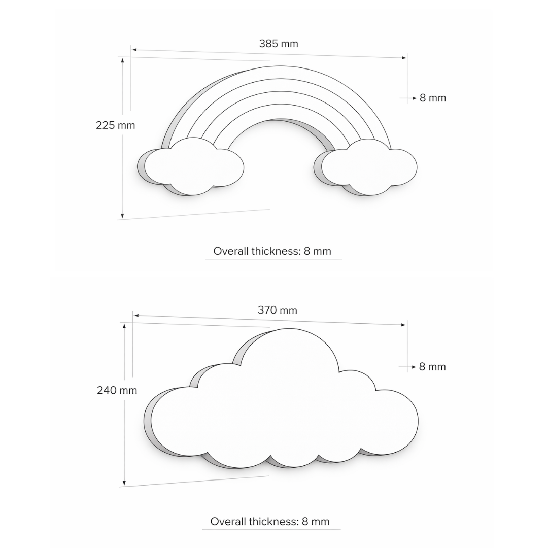 - ☁️ Nuages moelleux intégrés — 2 nuages blancs encadrent l’arc-en-ciel pour un ensemble cohérent
