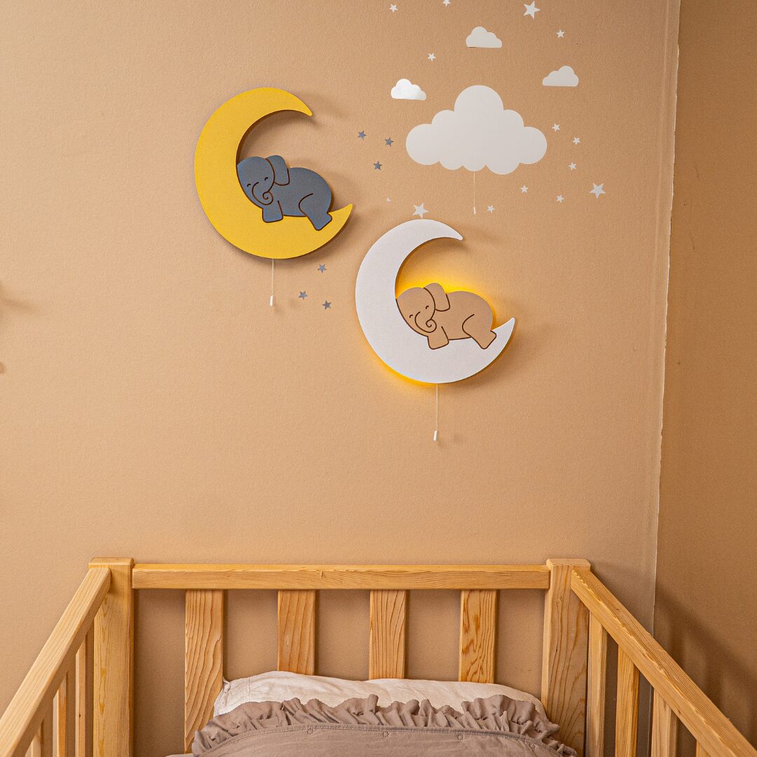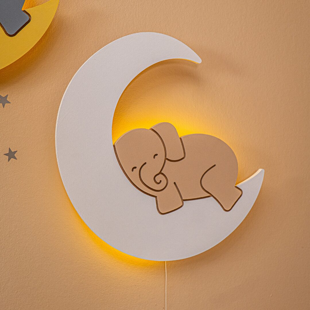 Veilleuse Murale Enfant Éléphant Endormi sur Lune en Bois Peint Main — Chambre Bébé Apaisante & Poétique