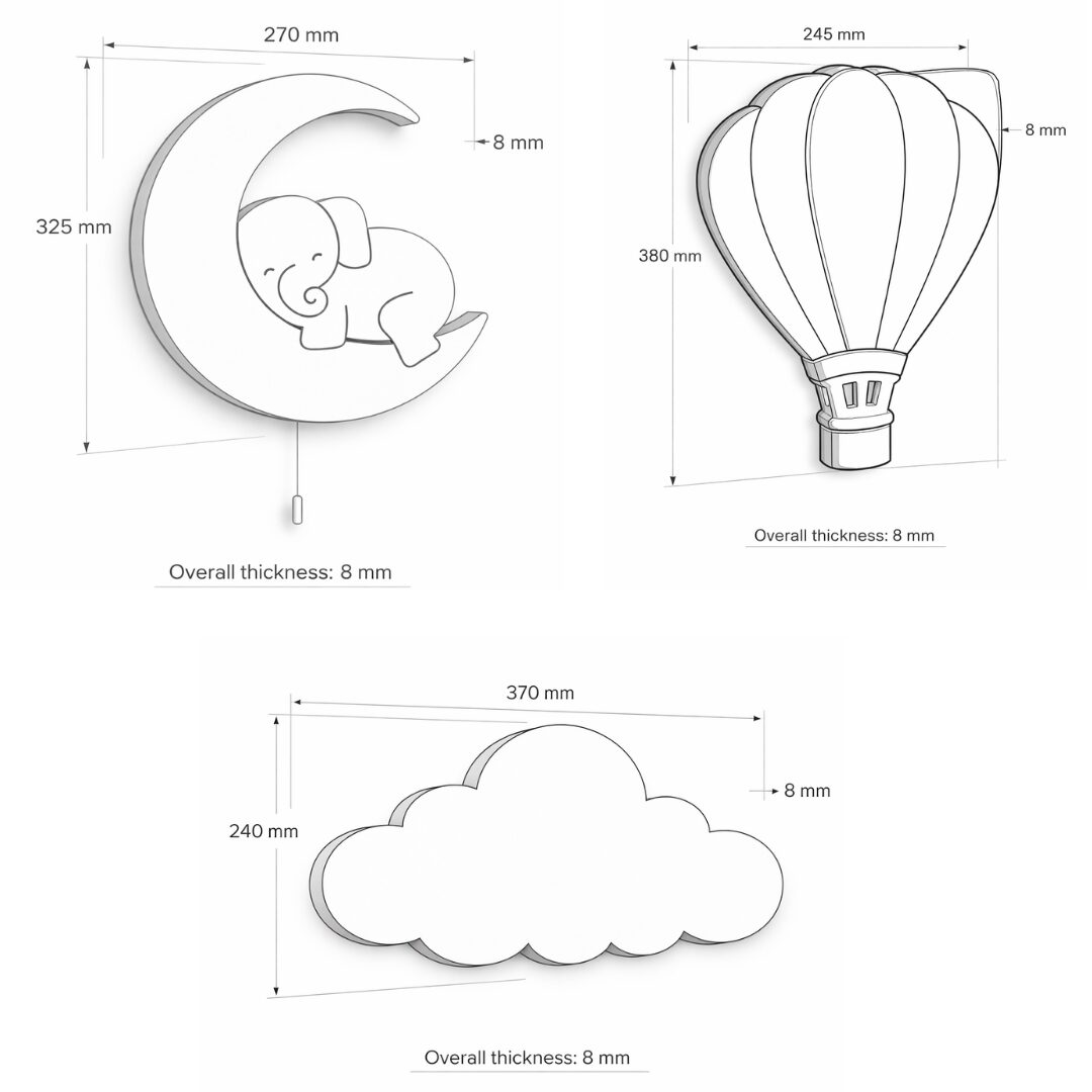 Éléphant sur lune (jaune) ,Éléphant sur lune (blanc) ,Nuage ,Ballon ,Set 2 pièces Éléphant + Nuage ,Set 3 pièces complet |