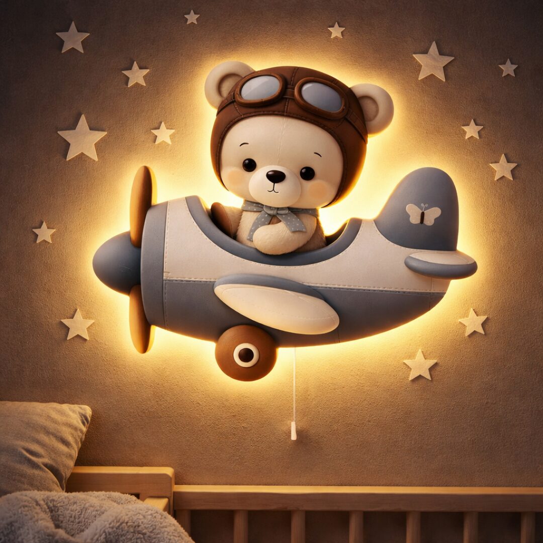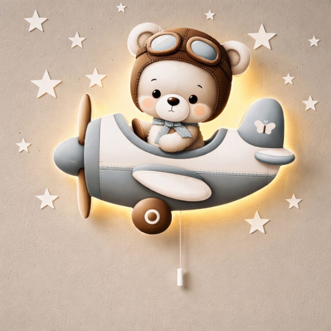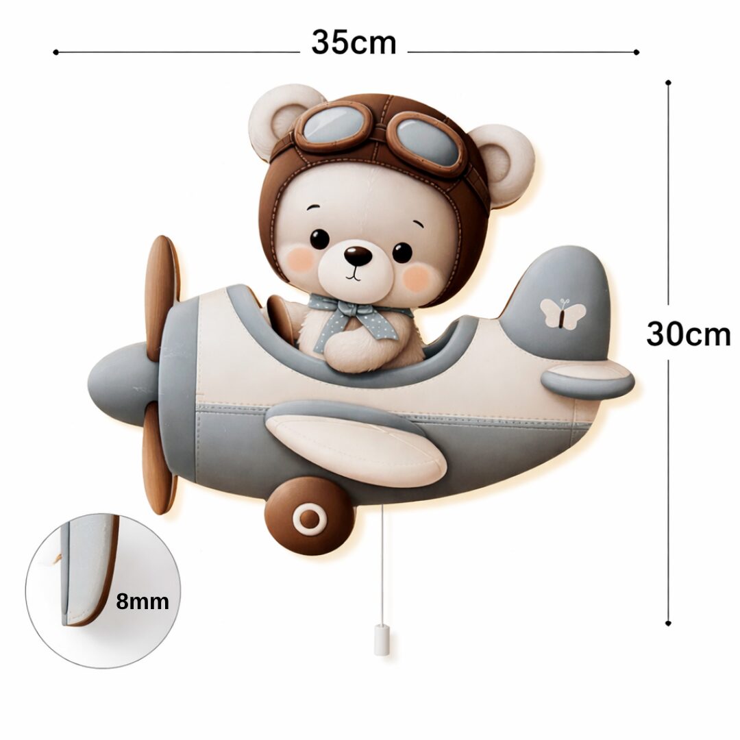Cap sur les étoiles ! La Veilleuse Murale Ours Pilote Cozy Kids met en scène un ourson crème aux joues rosées, installé aux commandes de son avion gris-bleu pastel avec hélice en bois marron et roue ronde kawaii. Son rétroéclairage LED contour chaleureux diffuse un halo doré enveloppant toute la silhouette. Design 3D relief ultra-mignon, interrupteur cordon à tirer. La veilleuse murale enfant thème avion la plus attendrissante du ciel.